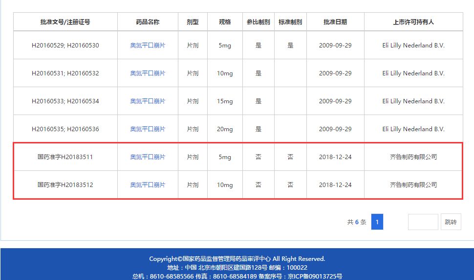 2018 年 12 月 24 日,齐鲁制药奥氮平口崩片(商品名:枢贝)获国家药品监督管理局(NMPA)批准上市。该药为仿制药是按新注册分类 4 类申报,获批后视同通过一致性评价。